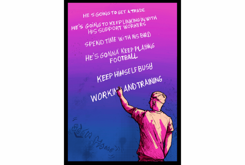 Across five months, the story of Callum grew from discussions about complex and often conflicting realities: wanting to change but feeling pulled back by old lives, using substances to cope with overwhelming emotions, and trying to navigate what it means to be a man in environments where vulnerability can carry risk. Sessions were fuelled by sausage rolls and fizzy drinks, and over time, relationships developed, conversations deepened, and Callum was created.